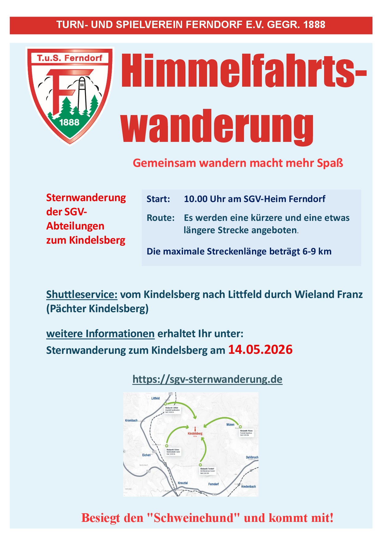 Gemeinsam bewegen heißt das Motto in diesem Jahr, deshalb kommt alle mit und wandert durch unsere Ferndorfer Wälder hinauf zum Kindelsberg, wo wir uns mit vielen anderen Vereinen zu einem gemütlichen Nachmittag treffen werden.